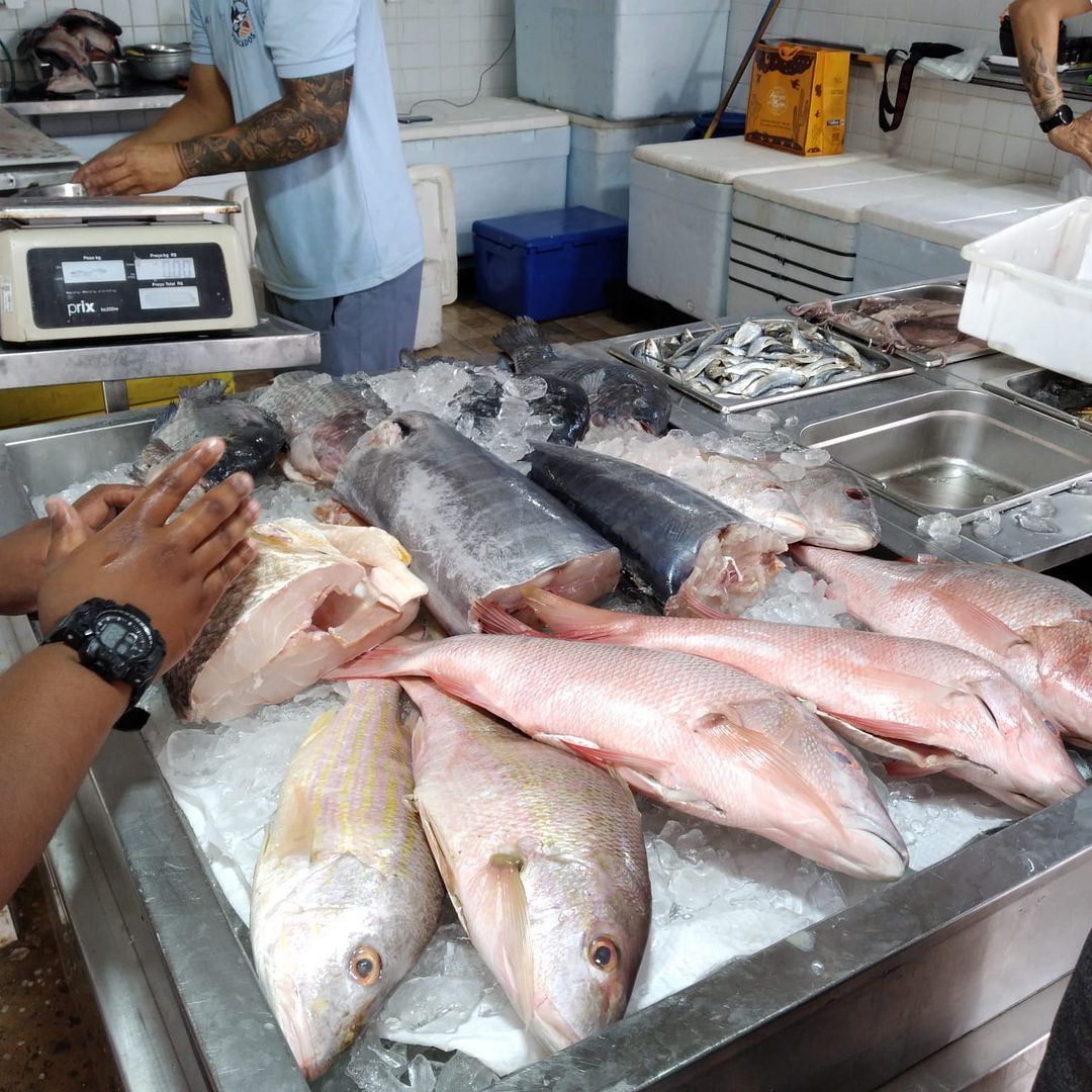 Ресторан необычный -- мы выбираем рыбу, которую нам приготовят.